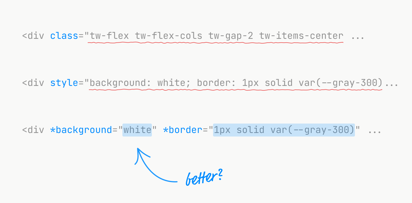 Apart from those limitations — which are already a dealbreaker — I don’t like that all CSS properties and values are stuffed into a single style attribute. I also don’t like it when lots of Tailwind class names are stuffed into a single class attribute.