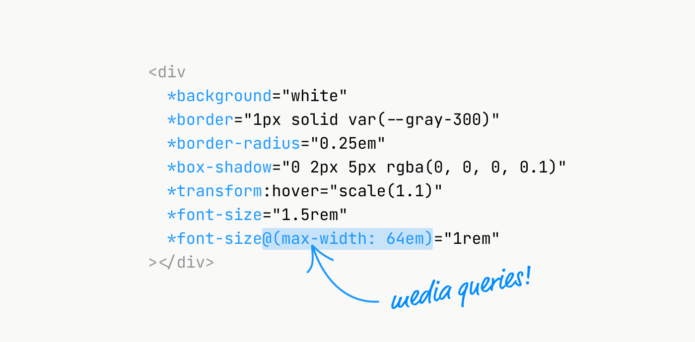 Each *property="value" attribute is automatically converted into a real CSS rule at runtime. The element declares its own style behavior — without losing CSS flexibility.